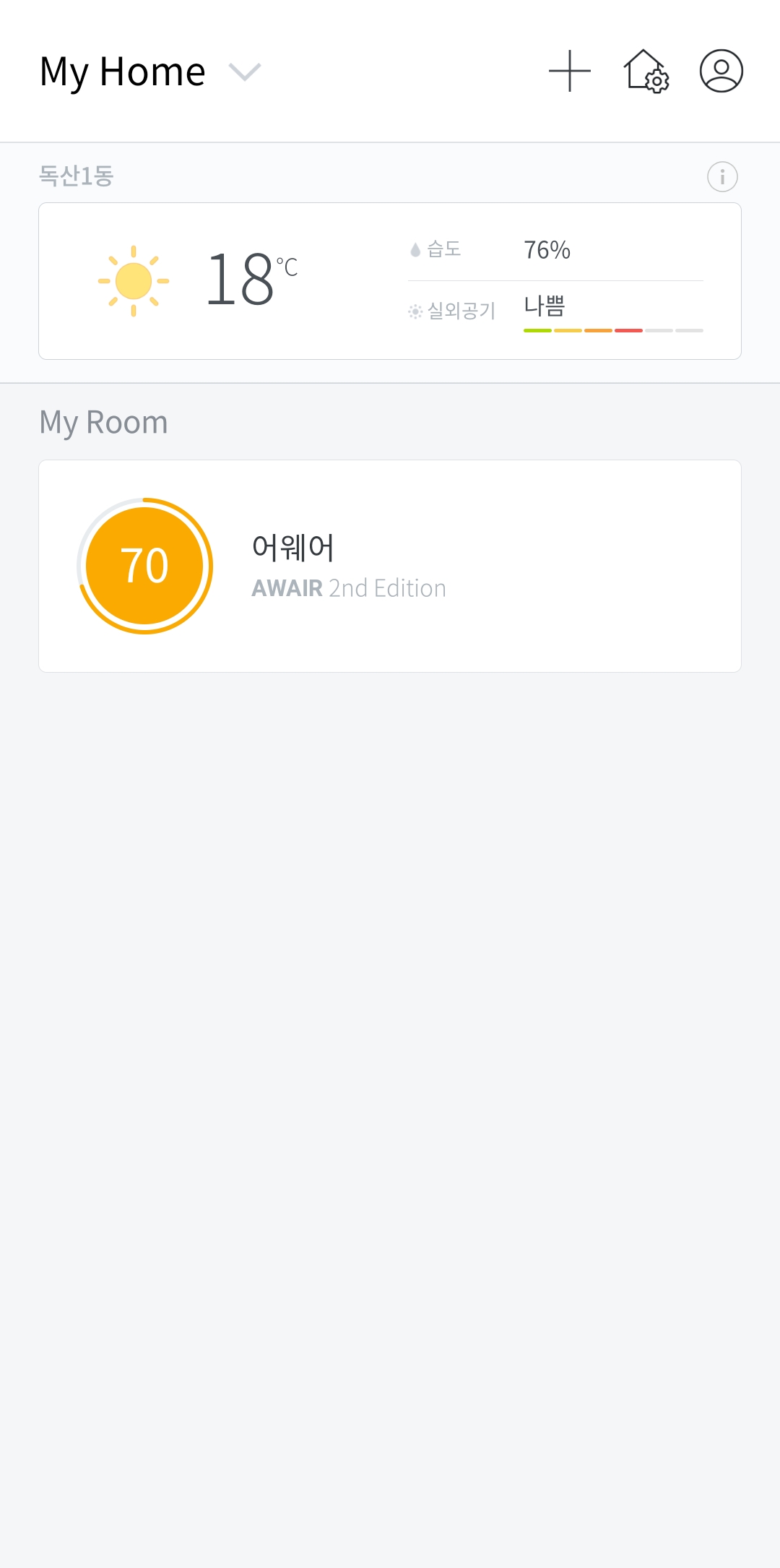 사는 동네의 날씨정보와 Awair 2nd의 수치를 보여주는화면
