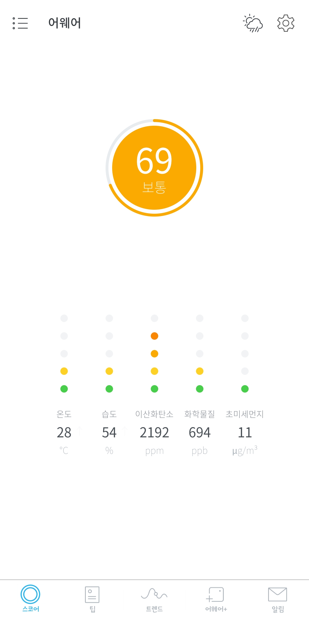 두번째는 측정 상세화면 이건 지금 자고일어나서의 상태라서 수치가 좀 높은거고 보통 집에 사람이 없으면 이산화탄소는 최소수치인 400정도까지 떨어짐.